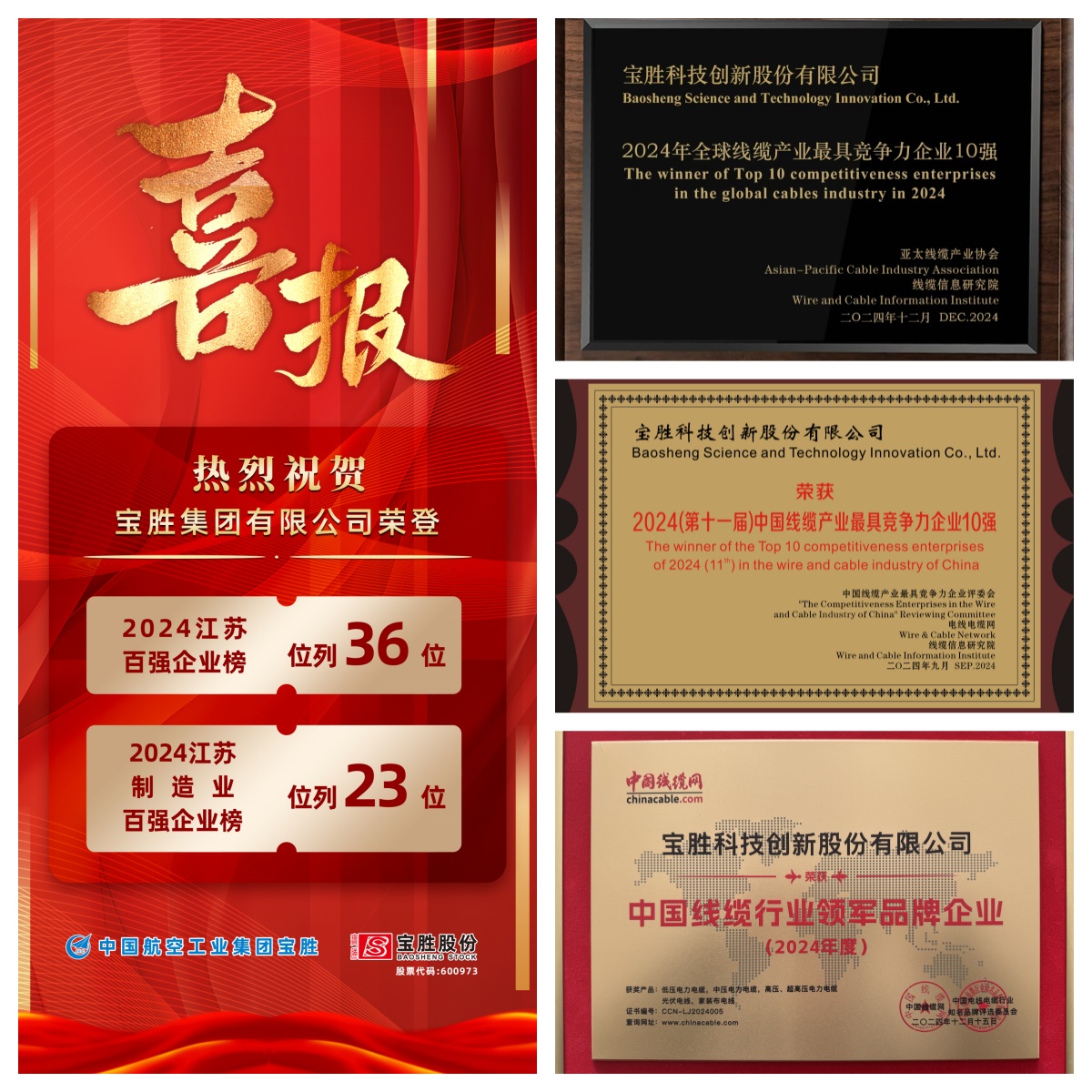 憑借過硬的產(chǎn)品及服務(wù)質(zhì)量,寶勝成功贏得了廣大客戶的信賴,行業(yè)影響力持續(xù)提升,2024年公司再次入選“全球線纜產(chǎn)業(yè)最具競爭力企業(yè)10強(qiáng)”、連續(xù)11年榮膺“中國線纜產(chǎn)業(yè)最具競爭力企業(yè)10強(qiáng)”、相繼榮獲“中國線纜行業(yè)領(lǐng)軍品牌企業(yè)”、江蘇百強(qiáng)企業(yè)、江蘇制造業(yè)百強(qiáng)企業(yè)等稱號,寶勝品牌持續(xù)擦亮。